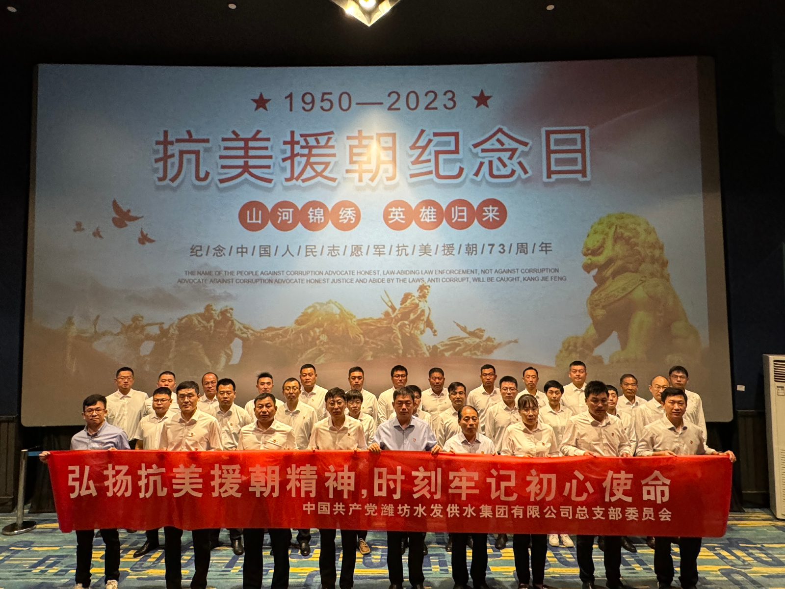 10月25日是抗美援朝73周年紀念日,為教育引導廣大黨員干部弘揚英模精神,重溫先烈英雄事跡,弘揚偉大抗美援朝精神。供水集團黨總支組織開展“弘揚抗美援朝精神 時刻牢記初心使命”主題黨日活動。通過重溫入黨誓詞、觀看愛國主義電影等方式,引導廣大黨員干部弘揚傳承家國情懷,把愛國奮斗內(nèi)化于心,外化于行。